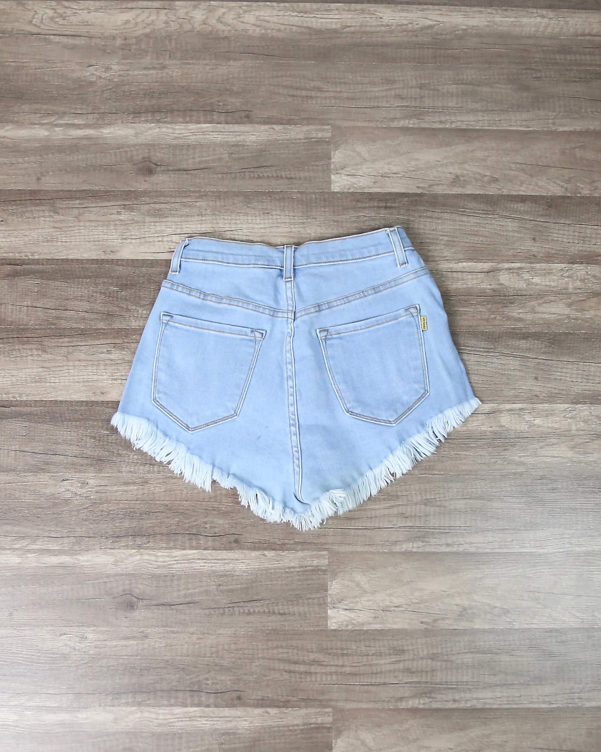 / High Waisted Distressed Denim Shorts in Light Wash